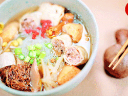 4百頁捲跟油豆腐泡各剪成三段放在冬粉上,再放上材料2,灑上香油及胡椒粉,最後淋入高湯,即可趁熱享用。