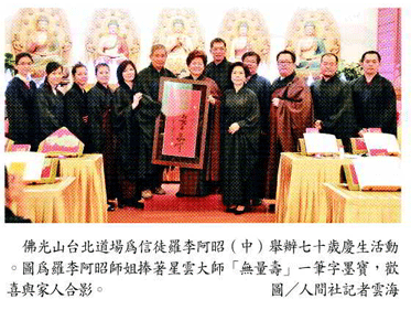 「人間最寶貴的資產就是歡喜」,佛光山開山宗長星雲大師以這一席話,贈給羅李阿昭,感念她平常對常住的護持,並慶賀其生日。