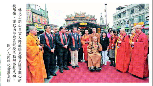 佛祖巡境隊伍昨天一路南下屏東,上午七時在以王爺信仰「迎王祭」聞名的東港東隆宮舉辦巡境啟程儀式,不僅屏東縣長曹啟鴻、東港鎮長王憲昭,以及屏東縣佛教會理事長見引法師率全體理監事等代表與會外,佛光山開山星雲大師亦風塵僕僕前往會場關心,足見一代高僧對此次佛祖巡境活動的重視。
