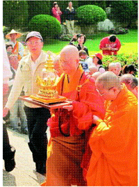 爭取到這麼一個難得的機會,達瑩長老尼親自出寺恭迎佛祖,從國際佛光會中華總會祕書長覺培法師手中接迎佛陀舍利,走進大雄寶殿安奉,寺內二十位法師也都列隊恭迎,大批信眾更將寺內擠得水洩不通。