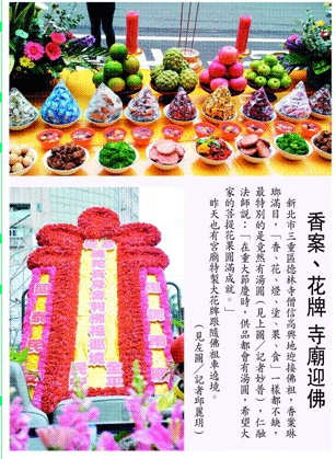 香案、花牌 寺廟迎佛 邱麗玥 |2011.12.12 語音朗讀 3184觀看次 字級 大 中 小 新北市三重區德林寺僧信高興地迎接佛祖,香案琳瑯滿目,「香、花、燈、塗、果、食」一樣都不缺,最特別的是竟然有湯圓,仁融法師說:「在重大節慶時,供品都會有湯圓,希望大家的菩提花果圓滿成就。」 昨天也有宮廟特製大花牌跟隨佛祖車遶境。 前一篇文章 佛光山之歌 響徹雲霄 下一篇文章 百尊土地公出動 桃園熱情迎佛祖 熱門新聞 01【遨遊藝事】 威尼斯沉船書店2025.12.2902【獻給動物朋友的詩】 最可愛的動物詩路2025.12.2503以法相聚 佛光山員義工歲末聯誼2025.12.2404【寰宇采風】京都最溫柔的秋色:紅葉永觀堂2025.12.2605台北道場歲末聯誼 感謝義工同行菩薩道2025.12.2706社論--悲憐天下父母心2025.12.2507【中醫專欄】 中醫防失智之道2025.12.2708南瓜籽紅豆黑芝麻 含天然助眠營養素2025.12.2609南天寺英文佛學營 佛青培養內在力量2025.12.2410奧斯汀佛光人 感謝警消守護2025.12.24 訂閱電子報 台北市 天氣預報 台灣一週天氣預報 相關報導 緬懷星雲大師 全球佛教學者暢談人間佛教245校雲端交流 凝聚三好共識推廣生命教育 林聰明獲特殊貢獻獎西方寺瑜伽課 接引民眾結法緣元宵乞龜 390兩大金龜亮相基督城地震10年 佛光山領眾祈願 作者其他文章鐵道追見台北城小檔案 海明禪寺地下秀場看人間兩岸藝起慶元宵迎燈節北捷推彩繪列車照顧失智老人錦囊有妙計