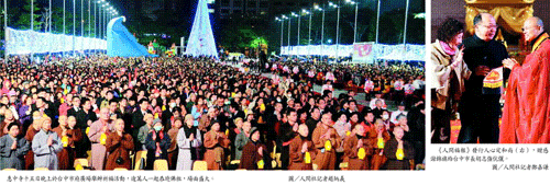 【記者羅智華台中報導】雙手合十、虔誠念誦佛號,十五日晚間於台中市府廣場舉行的「萬眾恭迎佛陀舍利祈福晚會」湧入逾萬市民同霑法喜,齊聲念佛的唱誦聲回盪會場,撼動人心;台中市佛教會、台中市佛教聯合會等眾多團體也來共襄盛舉,場面十分盛大。