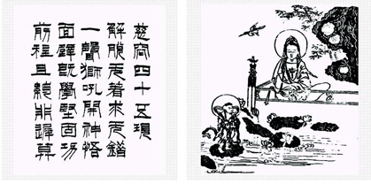 此處〈慈容四十五現〉版畫嚴整,似民間信仰中「觀音媽」之構圖,而偈語作者不詳,其偈為:「解脫無著求無錯,一聲獅吼開神悟;面壁既學堅固功,前程且約非遲莫。」