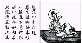 而〈慈容四十六現〉版畫雖與善財童子參訪賢勝優婆夷無關,不過版畫中的觀音造型似乎依據此處偈語「據坐凝眸」、「無限清風」為創作意像。因此,造型別有韻味,菩薩手持如意,容貌清閒之狀,以婀娜斜倚之姿,頗似明清之際「仕女圖」樣貌,唯版畫獨特之處,則是刊刻者似有若無的借由人物「頭光」,點出凡、聖之別。