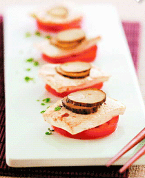 4. 將豆腐片放在番茄片上,再置上酸黃瓜片,食用時,可一份份的食用。