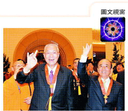 圖文視窗--- 兩院長 佛光緣深厚 慧延 |2011.12.31 語音朗讀 512觀看次 字級 大 中 小 行政院院長吳敦義、立法院院長王金平,昨參與佛陀紀念館的祈福典禮。吳敦義談到當年前往泰國迎佛牙舍利的感動情況,他說佛館是全球千千萬萬的功德主共同發心建成。王金平表示,四十多年前就與佛光山結緣,全家人和佛光山一起成長,全世界佛光人聚沙成塔,完成佛陀紀念館,意義重大。 圖/人間社記者慧延 前一篇文章 新聞導航-- 數萬信眾超薦祈福 下一篇文章 圖文視窗-- 南非團 不遠千里來 熱門新聞 01房市冷 仲介業跨足都更危老整合2026.02.2102動物的精采瞬間(下)2026.02.2203朝山叩鐘 佛光山嶄新大雄寶殿迎春 2026.02.2104佛光山平安燈會 逾百萬人朝聖2026.02.2305【詩】紅豆控的紅龜粿2026.02.2306Q版初代超人力霸王 領航愛河灣2026.02.2107【印象旅人】烘爐地南山福德宮 踏青行2026.02.2108台北道場 新春禮千佛2026.02.2109南投燈會 佛光山鳳凰主燈傳送光明2026.02.2110佛光好市集 職人蔬食、極致咖啡 匯聚佛光大道2026.02.21 訂閱電子報 台北市 天氣預報 台灣一週天氣預報 相關報導 大悲懺法會南華登場 見證百萬人興學成就教育願心媽祖祈福文化節今擲筊求好日 將於9/27熱鬧登場白沙屯媽祖進香3/18出發 今晚放頭旗昭告四方 全台唯一水上遶境 復興宮媽祖石門水庫祈福 土地公迎頭牙誕辰 各地湧入大批信眾祝壽 鹽水武廟文昌祭傳承古風 道長為學子點竅門