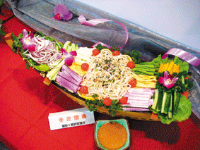 山藥烏龍麵半斤、紫色山藥、白色山藥、粉紅色山藥、西洋芹、紅蘿蔔、小黃瓜、蛋皮各二百公克;洋蔥、紫洋蔥各一百公克