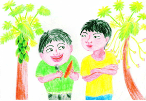 志堅輸了,悶悶不樂,志毅安慰他說:「哥!木瓜成熟了,還是大家都有份,從今天開始,我們共同來照顧它吧!」