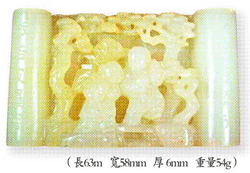 本件作品是相當難得的白玉類文房極品,「和合二仙」的表情生動活潑,背後雕刻的《心經》字體更是俊秀有力,玉質豐潤油亮,白度一流,屬上乘之作。