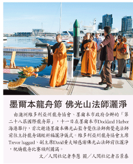 墨爾本龍舟節 佛光山法師灑淨 李慧 |2012.03.16 語音朗讀 1208觀看次 字級 大 中 小 由澳洲維多利亞州龍舟協會、墨爾本巿政府合辦的「第二十八屆國際龍舟節」,十一日在墨爾本巿Dockland Harbor海港舉行,首次邀請墨爾本佛光山監寺覺住法師與覺堯法師前往主持龍舟誦經祈福灑淨儀式。維多利亞州龍舟協會主席Trevor haggard、副主席David黃夫婦感謝佛光山法師前往灑淨,祝禱龍舟比賽順利圓滿。 文/人間社記者李慧 圖/人間社記者呂景泰 前一篇文章 佛館交通壅塞問題有解-- 高雄市議長出面協調 近遠程方案疏解車潮 下一篇文章 【佛館萬花筒】 滴水坊 菜餚獨步全台 熱門新聞 01台中新社花海 重現經典卡通2025.11.0602WTA、ATP年終賽 獎金創新高2025.11.0703佛光佈教師、友愛服務隊 精進行佛2025.11.0604《365日》贈嘉義香湖國際大飯店 佛光人結書香善緣2025.11.0605【生活快門】 喜見採茶女2025.11.0606水星室內樂團表演 中美寺傳遞愛與和平2025.11.0607日中文化藝術季 大阪佛光合唱團獻唱2025.11.0608【牽手一生】 最深的愛是 我陪你2025.11.0609健保補充保費變革 政院急踩煞車2025.11.0710再闖WTA年終賽 謝淑薇力拚第2冠2025.11.07 訂閱電子報 台北市 天氣預報 台灣一週天氣預報 相關報導 緬懷星雲大師 全球佛教學者暢談人間佛教245校雲端交流 凝聚三好共識推廣生命教育 林聰明獲特殊貢獻獎西方寺瑜伽課 接引民眾結法緣元宵乞龜 390兩大金龜亮相基督城地震10年 佛光山領眾祈願 作者其他文章聯繫東西思想 尋求更好世界