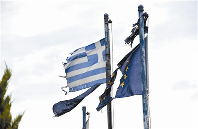 圖中這張攝於五月二十五日的檔案照中,科莫蒂尼工業區一家廢棄工廠的大門口,兩面殘破的旗幟迎風飄揚,左為希臘國旗,右為歐盟旗幟。