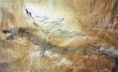 「飛翔」也是陳俐陵佛畫中常見的構圖,像在〈飛翔中的地藏〉畫中,地藏菩薩騰空飛翔於天際,手中的摩尼寶珠亦漂浮於空中,呈現菩薩的自在與廣大神通力;〈觀音與飛龍〉的靈感源於傳統的騎龍觀音,但陳俐陵筆下的觀音不站立於龍上,而是與龍共同競速飛馳,透過動線所鋪展出來的力道,卻也透露著幾分堅毅不拔的氛圍。