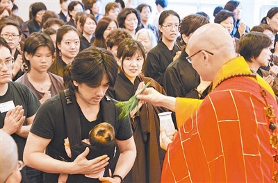 有信眾帶著剛出生的小嬰兒參加三皈五戒典禮。