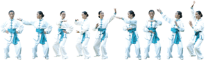 功理:中醫治病重在整體調整。故本組運動再度將調節情緒與調節脊柱,相合為用,加強整體效應。結合太極「虛領頂勁,輕柔舒緩」的動作,引導脊柱在輕隨慢移中從容舒展,曲中求直。