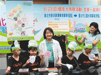 台北市、新北市鼓勵親子健走,精選二十四條「黃金親山步道」。北市衛生局副局長林秀亮(中)說,民眾集滿五個拓印,並參與健走大串聯活動,即可兌換健康好禮。圖/中央社非報系