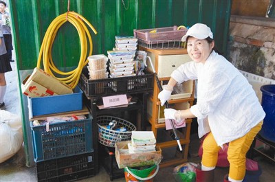廚餘的回收工作分兩個時段:中午十二點半到一點多,以及下午的五點半到六點多。每學年總有十一、二位高中部的男女學生會來這裡幫忙,他們各司其職,有的協助各班學生倒廚餘桶;有的指揮同學把竹筷、湯匙、餐盒分開處理,塑膠和金屬類各自歸類;有的站在水槽邊沖洗油膩的餐盒,並堆疊整齊,經過這樣處理之後,餐盒才能被視為紙類回收。