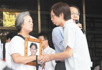 不滿台北地檢署對陳肇敏等人不起訴處分,江國慶的母親昨天手捧兒子遺照到北檢遞狀再議,民間司法改革基金會也舉辦「再議/在意」聲援活動,甫獲無罪定讞的蘇建和(右前)也到場聲援。圖/中央社非報系