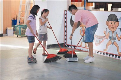 太平國小藝術營結束後,團員林懷恩帶著小朋友做服務學習,從愛護校園做起。