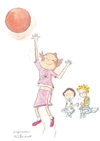 一顆籃球彈過來到珊蒂這裡。她撿起來從三分別線外投向籃框