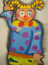 笑咪咪的小丑,讓人看了心情變得好快樂呀!此作品的色彩明度較高,與背景的黑色產生對比, 新莊市民安國小五年吉林柔君