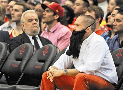 場邊球迷有人打扮起「大鬍子」(見左小圖/美聯社),迎接哈登在主場首場演出,更有不少華人球迷到現場力挺林書豪,甚至國旗都出現,給他支持力量,「哈林連線」前兩節震懾對手,取得八分領先。