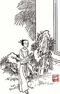 看改琦所繪,只見一位相貌俊美的小生伸出兩指,一路在打著什麼如意算盤。事實上,賈蓉的一生可以「成事不足,敗事有餘」來評定。在二十九回中,他因小事怠慢父親,賈珍毫不留情地要小廝當眾啐他口水以示懲罰,由此家教看他們父子三代脫軌的演出--賈敬出家修行僅為延長壽命、賈珍在家享樂無所不用其極、賈蓉小小年紀竟害了兩條人命,真可謂「上梁不正下梁歪」也。