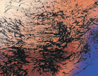 哈同作品「T1981-E11」中,和白紙黑字或黑線的中國書法間最大不同便是,哈同以噴霧式微細色點,凝結成深淺變化的色彩空間為書寫的背景,模糊而帶著遙不可知、深不可測的宇宙太虛,則為其精神的虛擬舞台。