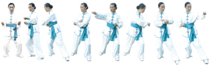 動作簡介:以馬步站立,雙手在腰際握拳,拳心往上,重心移右,左腳向左前方跨一步,雙拳向左前方四十五度作伸拉互動,復原後向右前方伸拉互動。