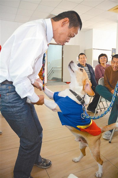 曾經車禍後腳癱瘓的流浪狗「米格」,奇蹟似地痊癒,五年前來到德蘭啟智中心,帶給身障者很大的喜悅。昨天為牠舉行感恩生日派對,院生「阿全」開心地帶著牠跳舞。圖/吳淑玲