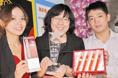 奪得首獎的「點滴摯愛系列」陳盈寰(左)手中的辣椒子試管變身為立體桌曆,指導老師蘇聖珠(中),陳宏麒(右)手中的作品是辣椒試管點滴炙熱的愛情。圖/記者邱麗玥