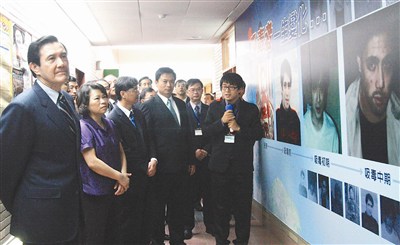 總統馬英九(左)昨天為中正大學防制藥物濫用教育中心揭幕,並參訪中心內的展出內容。圖為馬總統聆聽導覽人員簡介一位年輕人以圖片現身說法,從開始吸毒到死亡的歷程變化。圖/中央社