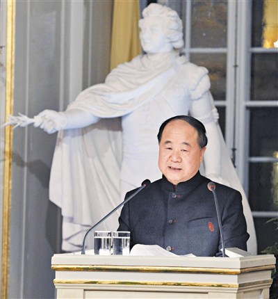講座在斯德哥爾摩的瑞典文學院舉行,莫言身穿灰色中山裝。莫言此前一天在記者會上的言辭,引起各方熱議,餘溫未了;一些對莫言持批評態度的作家,在場向前往聽講座的觀眾散發傳單,批評瑞典文學院將諾獎授予莫言。