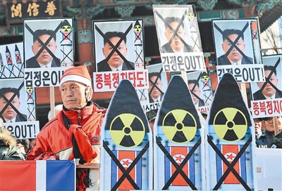 南韓保守派社會人士十二日手持北韓領導人金正恩的肖像,並在肖像上打叉,抗議北韓發射火箭。