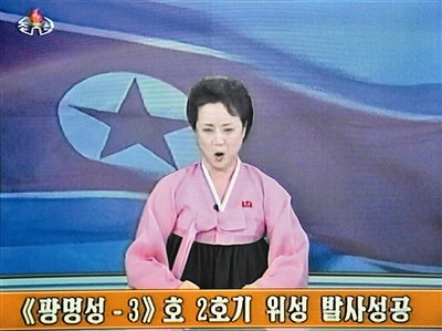 穿著粉紅色韓服的女主播,坐在展示北韓國旗的螢幕前,用激昂、勝利式的語調報導:「第二版光明星三號衛星(Kwangmyongsong-3)十二月十二日由西海太空中心發射成功。衛星已按計畫進入軌道。」