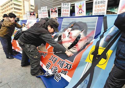 南韓民眾在首爾抗議,憤而畫破金正恩的肖像,譴責北韓發射火箭。圖/法新社