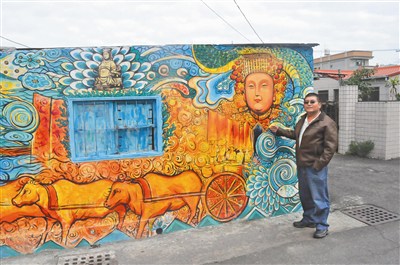 【本報台南訊】台南市安南區媽祖宮路一堵民宅圍牆,藝術家陳彥名採用金黃色為主體,把單調的牆面,換裝彩繪成進香的熱鬧場面,成為引人注目的街頭藝術。當地里長林志英說:「金黃色的媽祖神像,光彩奪目,很漂亮!」他希望能繼續向台江國家公園風景區管理處爭取經費,請藝術家畫出鄭成功與媽祖的故事。