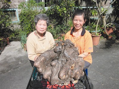 【本報花蓮訊】「嘿呦嘿呦拔蘿蔔,老太太,拔不動,快來幫忙拔蘿蔔!」這不只是兒歌,還出現在現實生活中,只不過蘿蔔換成了「巨無霸山藥」。花蓮縣鳳林鎮羅姓阿婆種出超大山藥,拔山藥時一個人拔不動,還呼喚媳婦出馬,兩人合力才把六十台斤重的山藥搬回家。