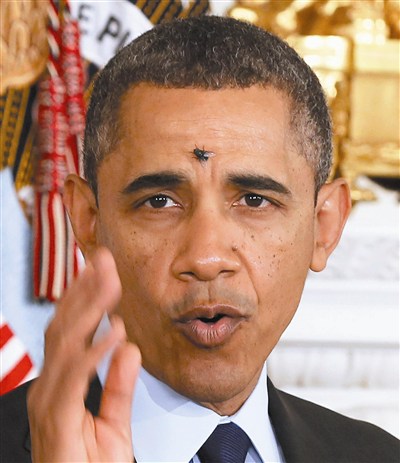 歐巴馬在華麗的白宮國家宴會廳發表談話時,蒼蠅在歐巴馬的頭附近橫衝直撞,還停留在歐巴馬額頭正中央(圖/路透)稍事休息。