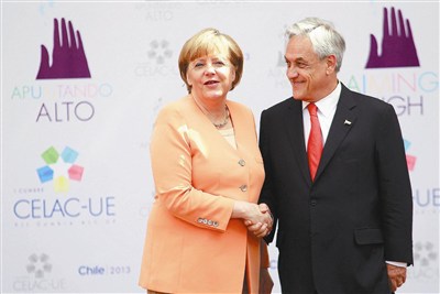 智利總統品尼拉(右)熱情歡迎前來參加拉美歐盟國家領袖會議的德國總理梅克爾。圖/新華社