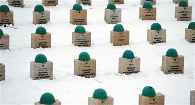 史達林格勒戰役是人類史上最慘重的戰爭之一,俄羅斯總理普亭一日舉行招待會,紀念戰役勝利七十周年。圖為殉職士兵公墓,頭盔都放在墓碑上方。圖/法新社