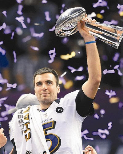 烏鴉隊以三十四比三十一險勝四十九人,獲選為MVP的佛拉柯舉起隊史第二座超級杯冠軍杯。圖/美聯社