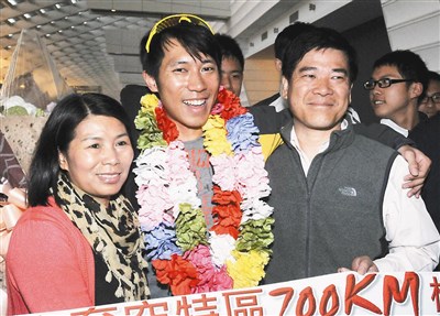 參加加拿大育空七百公里極地橫越賽的我國超馬選手陳彥博(中),昨天中午載譽歸國,受到爸爸(右)、媽媽(左)的熱情歡迎。圖/陳嘉寧