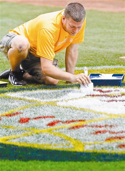 圖為工作人員昨天在草地塗上賽會Logo,迎接大賽的來臨。