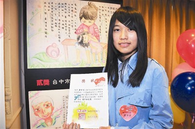 獲得國中組首獎、目前就讀南投瑞峰國中的蕭宇芳特別從南投前來領獎,她很開心能得獎,希望藉作品傳達對媽媽的愛。