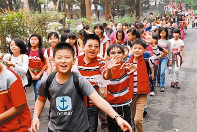 三百多名師生及社區民眾沿著省府大樓後方的虎山步道,「安步當車」的賞景兼隨手撿拾垃圾,一同提前歡度健康環保的兒童節。