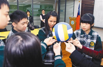王志文將排球改成頂球遊戲,每組六到八人分別用一根食指頂住球跑完全場(下圖/蘇健忠),行進間每個人都有機會當領導人,並相互溝通、研究戰術,讓體育課變得更有趣,還讓放棄學習的學生愛上體育課,甚至加入拳擊校隊。