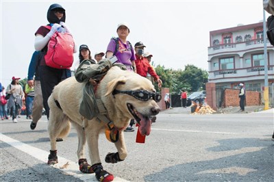 台中市蕭姓男子的拉布拉多狗「小胖」,從遶境第一天起,FBI酷帥打扮超吸睛,狗走了七年,主人則走了十二年。小胖十一歲,年紀大了,走起來有點吃力,主人陪牠慢慢走。