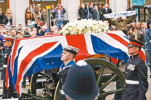 英國首相柴契爾夫人的喪禮十七日舉行,為一九六五年邱吉爾之喪以來,英國最盛大政治人物喪禮。上圖為柴契爾的黑色靈柩上,覆蓋著英國國旗。圖/路透