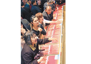 香港《東方日報》網昨日指出,近日大陸各大金舖異常熱鬧,大批民眾趁金價連日下跌搶購黃金。就拿廣州來說,金舖不論訂貨、付款、提貨都出現排隊人潮,店內各款金條被搶購一空。部分店舖更需延長營業時間四小時。香港《東方日報》報導,廣州一家大型金舖單是周末就賣掉近六十公斤黃金。店員嘆這幾天金舖頓變市場,擠得水洩不通;顧客買金像買菜,不假思索就訂。