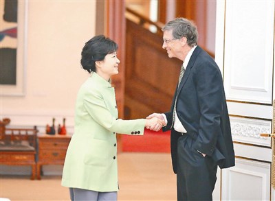 【本報綜合外電報導】微軟創辦人比爾蓋茲(左圖右/法新社)與南韓總統朴槿惠握手時,一手插在褲袋裡的不拘小節作風,昨天招致一些南韓媒體批評。